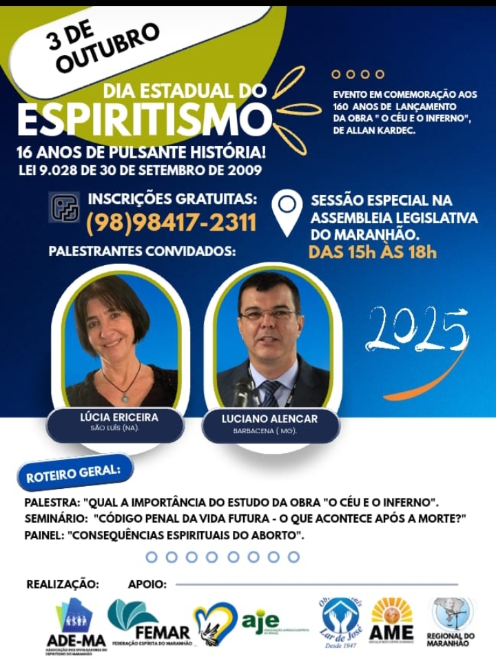Em comemoração aos 221 anos de nascimento de Allan Kardec, codificador do Espiritismo, e aos 16 anos do Dia Estadual do Espiritismo, os espíritas de São Luís estarão reunidos no próximo dia 3 de outubro (sexta-feira), na Assembleia Legislativa do Maranhão.