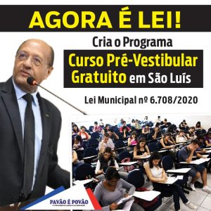 Agora é Lei! Lei Municipal nº 6.708/2020 de autoria do Vereador Pavão Filho, cria o Programa Curso Pré-Vestibular para Todos, objetivando melhor preparar os alunos das escolas públicas para o ENEM e vestibulares, além de disponibilizar aos estudantes a revisão de conteúdos, macetes e dicas.