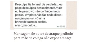 Três minutos depois, mostram as mensagens, o adolescente implorou à mãe do colega para que o conteúdo da conversa não fosse revelado à escola: “Desculpa tia. Foi mal de verdade… eu peço desculpas pessoalmente, mais eu te pesso [sic] vc não conhece meus pais, eu emploro, não faz nada disso nao, era pra ser só uma brincadeira, mais acabou nisso, desculpas”.