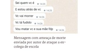 “Vc vai morrer. Vc tá fudido. Vou matar vc e sua mae fdp [sic]”, escreveu o estudante ao ex-colega em uma das mensagens enviadas no dia 7 de fevereiro, juntamente com imagens de armas. Ao ver as mensagens no celular, uma semana depois, a mãe do garoto ameaçado reagiu: “Vou na escola hj mostrar o tipo de conversa que vc tem com as pessoas. Aqui ninguém tem medo de vc não”.