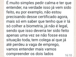“A situação tá é pior porque agora você termina o curso né e não pode receber o certificado e você ainda é obrigado a ir depois lá para fazer biometria entendeu, porque o tempo que você tava indo para lá para fazer o curso a biometria não tava funcionando e agora eu tô aqui esperando eles me darem um ok para mim tá indo lá para botar a biometria entendeu pra poder validar lá no Detran e essa situação está insustentável diz o aluno.