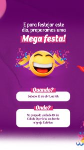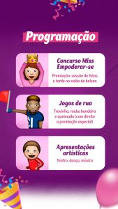 Na oportunidade serão ofertadas várias brincadeiras pra jovens e adultos, atrações musicais, rifas de uma caneca com logo marca, e procedimentos de embelezamento, cabeleireiros no local.