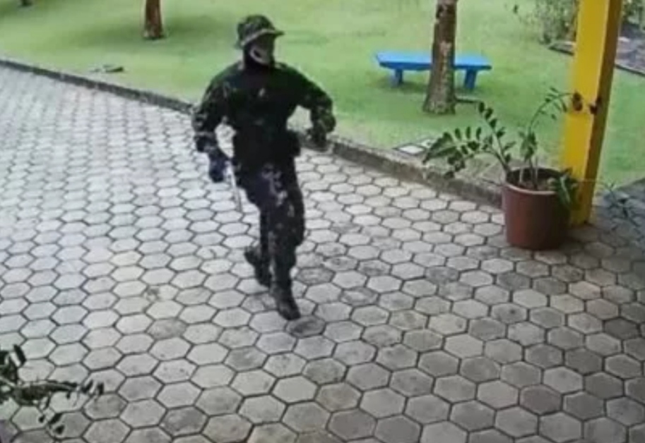 “Ele estava com uma pistola semiautomática, estava com uma roupa camuflada, o rosto coberto com uma máscara de forma que não conseguimos, pelo vídeo, identificar o rosto”, explicou Celante.