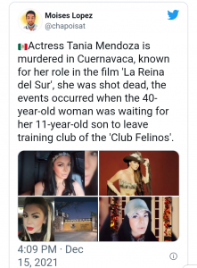 A atriz e cantora Tania Mendoza, conhecida pelo papel de Rainha do Sul, foi morta a tiros na quarta, 15 de dezembro, enquanto esperava o filho de 11 anos, que jogava futebol em um clube na cidade de Cuernavaca.
