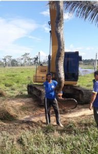 As imagens mostram a cobra sendo levantada por uma máquina que realiza serviços pesados de drenagem.