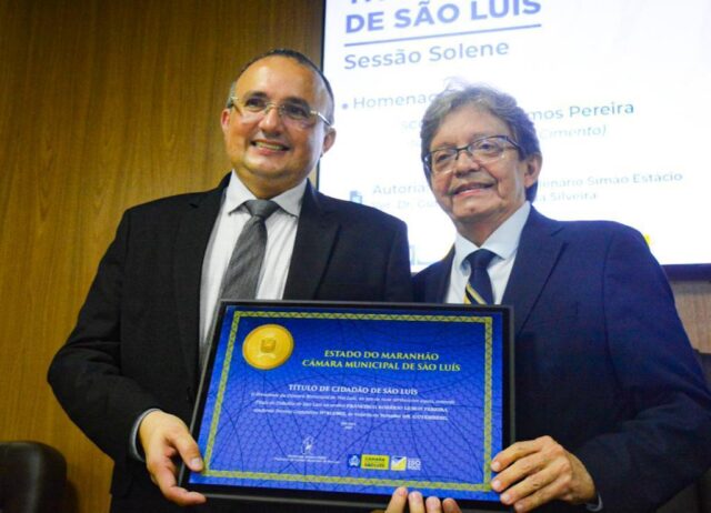 Em um ato de reconhecimento pelos serviços prestados à capital maranhense, a Câmara Municipal de São Luís, por meio do vice-presidente da casa, vereador Dr. Gutemberg Araújo (PSC), entregou o título de Cidadão Ludovicense a Francisco Robério Lemos Pereira, empresário cearense e ex-presidente da Associação dos Comerciantes de Material de Construção do Maranhão (ACOMAC – MA).
