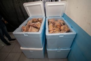 Os itens dos kits são produzidos pela agricultura familiar local. Nesta primeira etapa, os alunos receberam frangos, peixes, frutas, legumes e verduras, além de farinha produzida na região.