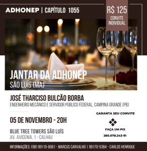 O Jantar Adhonep será realizado no Blue Tree São Luís Hotel e terá início às 20hs, contará com a presença de José Tharciso Bulcão Borda, engenheiro mecânico e servidor público federal de Campina Grande/PB que trará uma palestra motivacional baseada em sua experiência de vida.