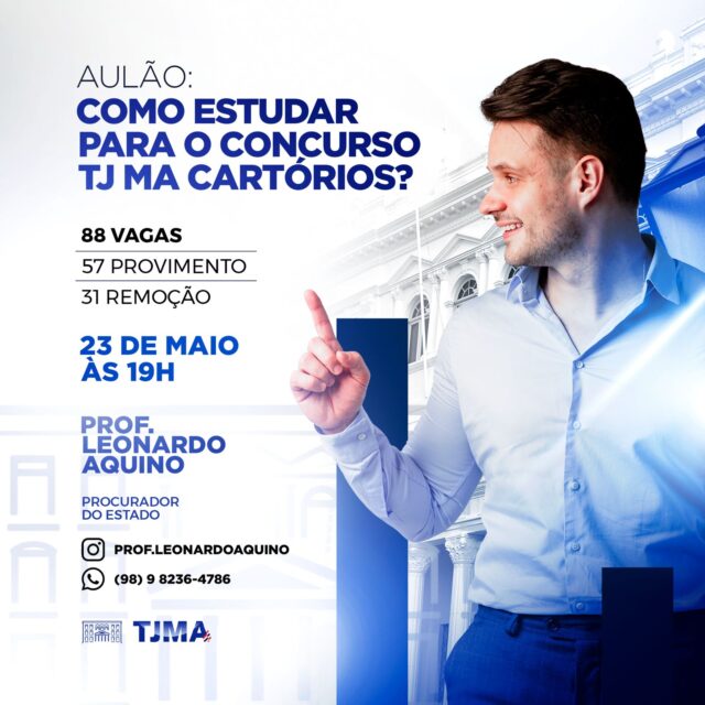 O Professor Leonardo Aquino irá compartilhar suas estratégias comprovadas para ajudar você a se preparar de forma mais inteligente e alcançar a tão desejada aprovação no concurso de cartórios do Estado do Maranhão.