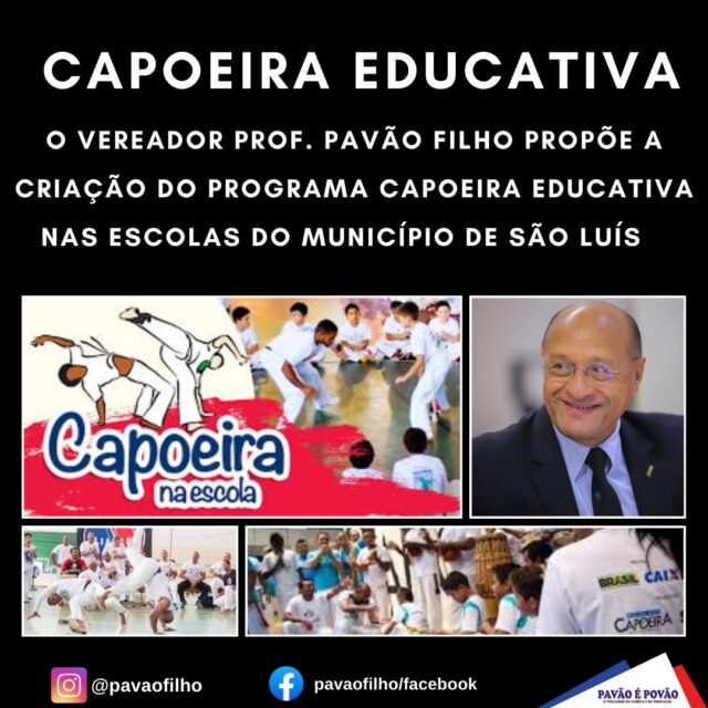 Vereador Prof. Pavão Filho, protocolou na Câmara Municipal de São Luís o Projeto de Lei nº 166/2024, propondo a criação do PROGRAMA CAPOEIRA EDUCATIVA nas escolas da rede municipal de São Luís, que tem como principal objetivo inserir a capoeira como modalidade de atividade prática nas escolas.