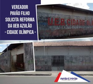 O Vereador Pavão Filho, apresentou o requerimento 329/2019, aprovado por unanimidade pela Câmara Municipal, solicitando a Prefeitura de São Luís e a Secretaria Municipal de Educação, a Reforma Completa da Unidade de Educação Básica (UEB) Cidade Olímpica – Colégio Azulão.