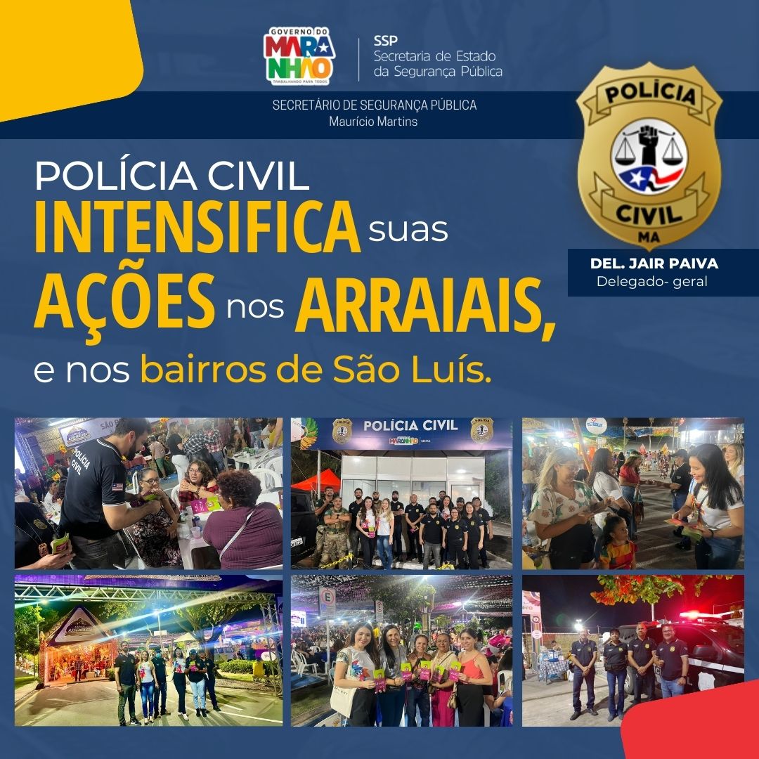 A Secretaria de Segurança Pública do Maranhão, através da delegacia geral de Polícia Civil, sob o comando do delegado geral, DPC Jair Paiva visando garantir a segurança da população ludovicense, determinou que, investigadores, escrivães, e delegados que intensifiquem a segurança nos arraiás da grande ilha, muito importante iniciativa porque precisamos da polícia na rua para cuidar do povo.