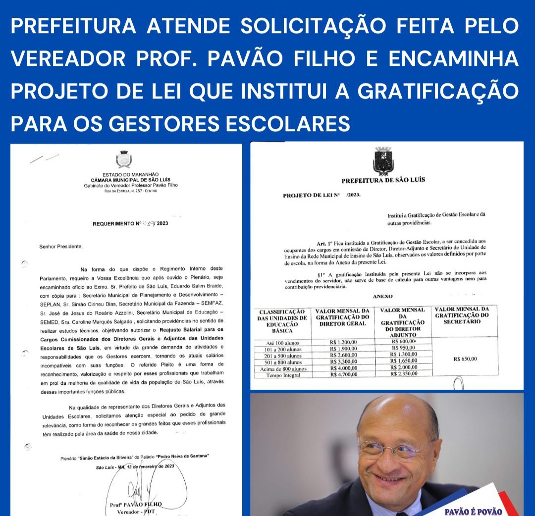 Atendendo solicitação feita através do Requerimento nº 419/2023, de autoria do Vereador Prof. Pavão Filho, aprovado por unanimidade pelos Vereadores, que solicitou Reajuste Salarial para os Cargos Comissionados dos Diretores Gerais e Adjuntos das Unidades Escolares de São Luís, o Prefeito Eduardo Braide, encaminhou para Câmara Municipal o Projeto de Lei nº 0005/2024 que institui a Gratificação de Gestão Escolar.