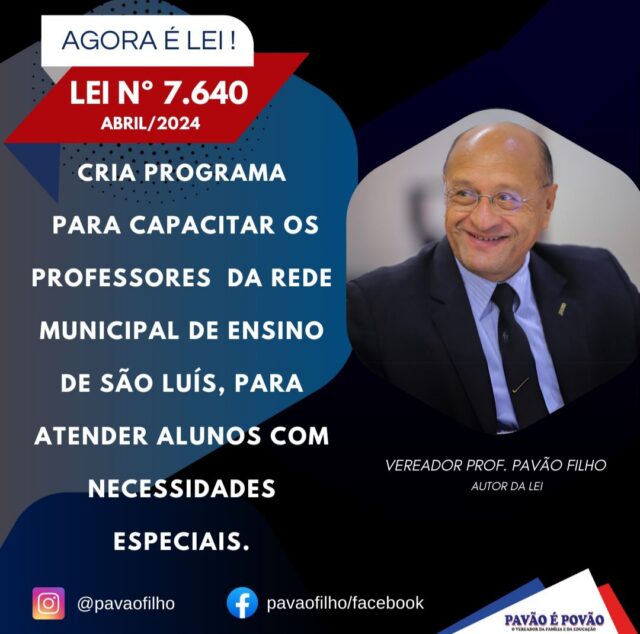 Já está em vigor a Lei nº 7.640/2024, de autoria do Vereador Prof. Pavão Filho, Sancionada Pelo Prefeito de São Luís, publicada em 10 de abril de 2024, que institui a Prefeitura Criar Programa de Qualificação do Magistério e a Assistência Especial aos professores e demais profissionais da rede Pública Municipal de Ensino de São Luís, com o objetivo de atender as necessidades dos alunos do ensino fundamental que têm transtorno do espectro autista, comorbidades e outras deficiências sensoriais, intelectuais e físicas.