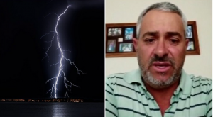 “É natureza de Deus. Vou te falar. Olha, céu limpinho. Ali já começa [a chuva]. Céu limpo, está de sol, agora olha pra você ver como que está o Minduri”, diz, antes do raio atingir o chão.