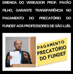 A Câmara Municipal de São Luís aprovou em regime de urgência, solicitado pelo Vereador Prof. Pavão Filho, o Projeto de Lei do Executivo Municipal nº 256/2023, que dispõe sobre os critérios de rateio do precatório do Fundo de Manutenção e Desenvolvimento do Ensino Fundamental e de Valorização do Magistério (FUNDEF) referente ao valor de 402.572.043,11, divididos em 3 (três) parcelas anuais e sucessivas, sendo 40% em 2023, 30% em 2024 e 30% em 2025, do valor recebido 60% será destinado para pagamento dos profissionais do magistério da Rede Pública Municipal de Ensino de São Luís.