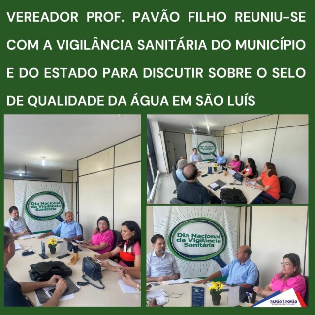 Vereador Prof. Pavão Filho esteve reunido, na semana passada, na sede da Superintendência de Vigilância Sanitária do Estado – SUVISA, juntamente com a Coordenação da Superintendência de Vigilância Epidemiológica e Sanitária do Município – SVES, para discutir sobre o cumprimento da Lei Municipal nº 6.682/2020, de sua autoria, que estabelece a obrigatoriedade da emissão do Selo de Qualidade da água mineral ou potável consumida em São Luís.