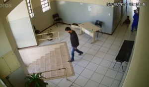 O suspeito, que aparece nas imagens arrastando a vítima, pelos cabelos, para fora de uma sala de atendimento e, depois, realizando as agressões com chutes, está foragido, de acordo com a polícia.