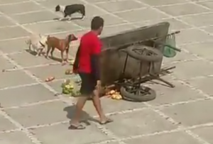 “O senhor não pode fazer isso comigo não. O senhor está me prejudicando”, grita o ambulante enquanto o policial joga as frutas no chão.