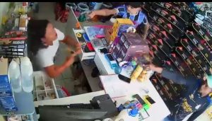 Um deles anuncia o assalto e a vítima, no balcão da loja, entrega celular, dinheiro do caixa e outros pertences.