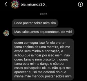 “Minha mãe está desesperada. Sabe porque? Ela quer fama, porque está acabando a fama dela, ela não tem mais. Eu não ligo para isso, eu só quero ser famosa com a minha dança, porque eu amo dançar. A minha avó já tinha falado na rede social e ela veio hoje a tarde falar que não sabia de nada. Cínica, né. É a minha mãe”, pontuou.