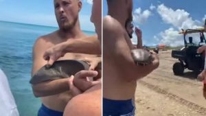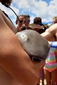 Um homem atraiu grande atenção em Jensen Beach (Flórida, EUA) no último fim de semana após ser visto caminhando com um tubarão-lixa (também conhecido como tubarão-enfermeiro) nos braços como se fosse um bebê.