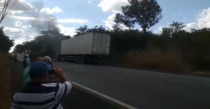 Sem ter ajuda para apagar o fogo de seu caminhão ele dobra o joelho e pede a Deus que mande chuva.