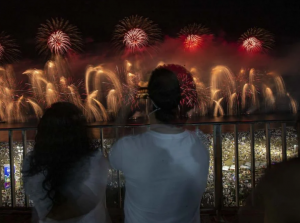 A queima de fogos durou cerca de 16 minutos em um espetáculos de luzes e cores, como vermelho, verde e prata. Um dos pontos altos foram as cascatas douradas.