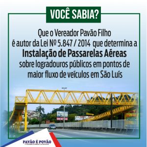 Você sabia? Que o Vereador Pavão Filho é autor da Lei Municipal nº 5.847/2014, que dispõe sobre a instalação de passarelas aéreas sobre logradouros públicos de grande movimento em São Luís