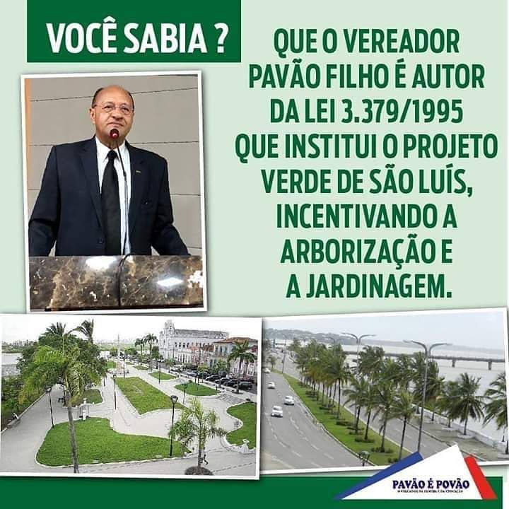 O projeto Verde de São Luís, é uma Lei de autoria do Vereador Pavão Filho, que tem o objetivo de incentivar a população a desenvolver práticas que aumentem o cultivo da jardinagem em nossa cidade, através do plantio de árvores nos canteiros e calçadas de logradouros públicos, assim como trabalhar para o ajardinamento e arborização de praças, com foco na sustentabilidade ecológica .